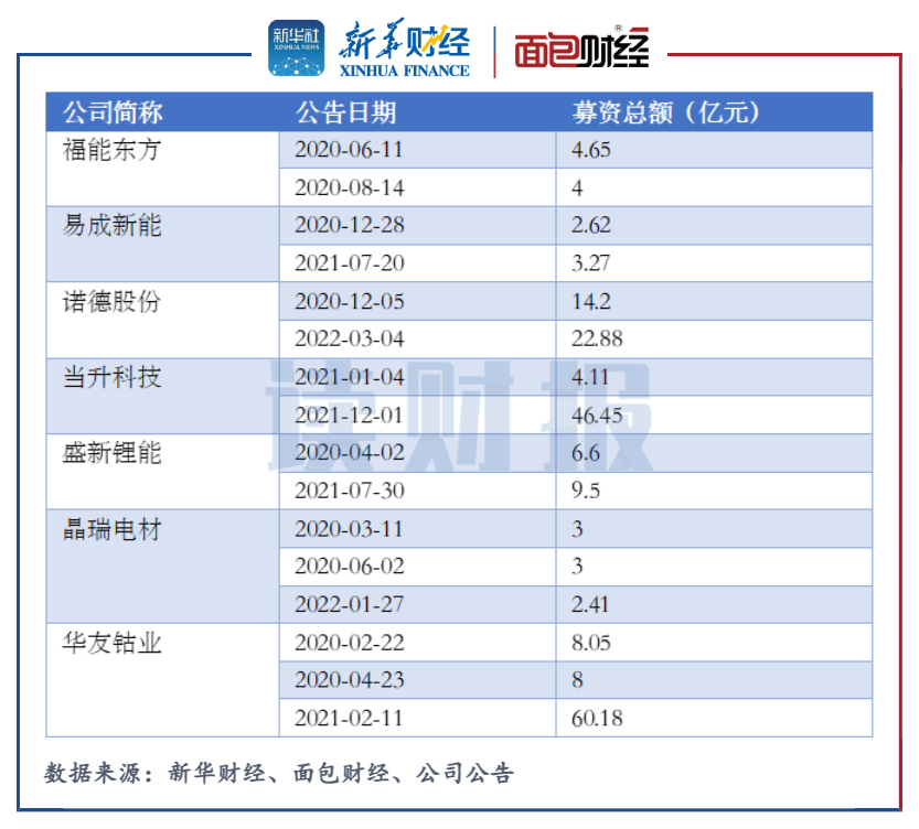 諾德股份在2020年12月和2022年3月通過定增分別募資14.2億元和22.88億元。當(dāng)升科技在2021年1月和12月通過定增分別募資4.11億元和46.45億元。華友鈷業(yè)在2020年2月、4月和2021年2月通過定增分別募資8.05億元、8億元和60.18億元。其余還有四家鋰電池板塊上市公司均完成兩次及以上定增募資。