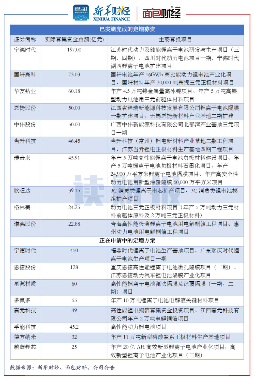 觀察可得,寧德時(shí)代、恩捷股份已實(shí)施完成的和正在申請(qǐng)中的定增募資的募資規(guī)模均較高。
