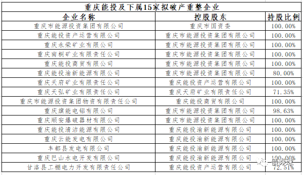 據報道,重慶能源集團等16家企業申請破產重整,經查詢,除重慶能投外,其他15家公司均為重慶能投控股子公司。從相關信息來看,本次破產重整似乎早有計劃。