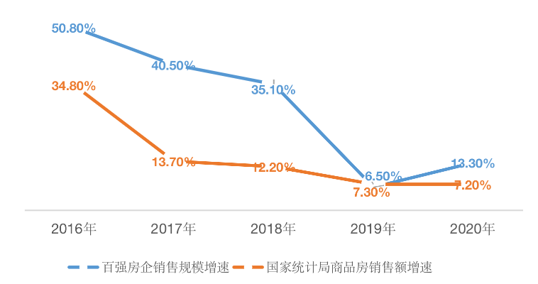 圖:2016年-2020年百?gòu)?qiáng)房企及行業(yè)增速(銷售金額)