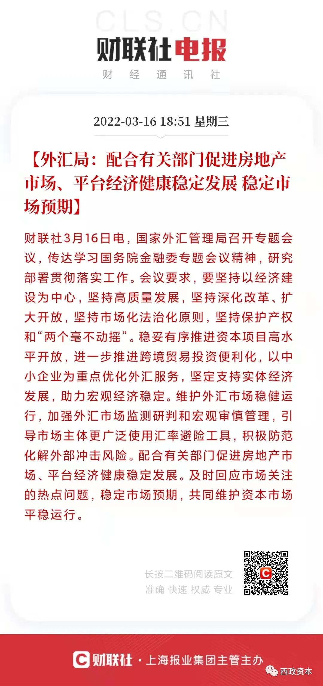 2022年3月16日上午,國務院金融穩(wěn)定發(fā)展委員會召開專題會議,研究當前經濟形勢和資本市場問題。會議提出,“在當前的復雜形勢下,最關鍵的是堅持發(fā)展是黨執(zhí)政興國的第一要務,堅持以經濟建設為中心”;會議強調,“有關部門要切實承擔起自身職責,積極出臺對市場有利的政策,慎重出臺收縮性政策”。隨后,央行、銀保監(jiān)會、證監(jiān)會、財政部、外管局等均積極表態(tài)維穩(wěn),并及時研究和提出有利有效的防范化解房地產風險應對方案。