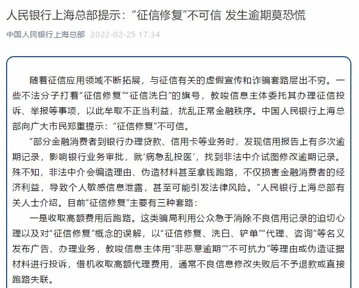人民銀行上海總部有關人士強調:“征信領域不存在‘修復’‘洗白’等說法,凡是聲稱合法的、收費的‘征信修復’都是騙局,任何人都無權隨意刪除、修改征信記錄。”