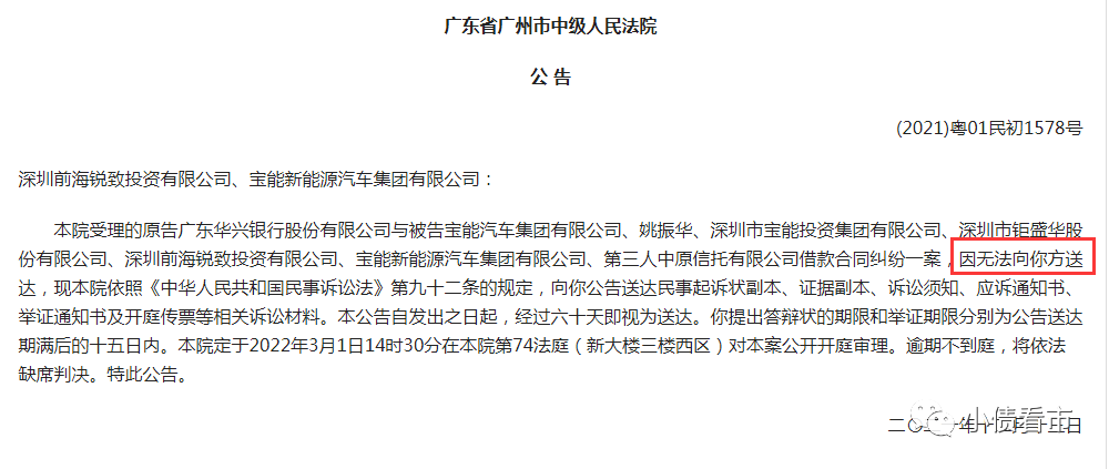 《小債看市》注意到,廣州市中級(jí)人民法院2021年12月13日的一份送達(dá)公告中,廣東華興銀行與“寶能系”借款合同糾紛一案,顯示無(wú)法送達(dá)。