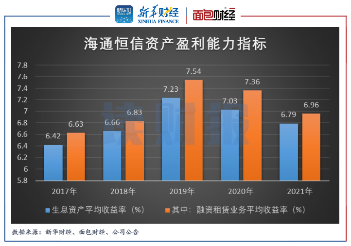 研究發(fā)現(xiàn),海通證券融資租賃子公司海通恒信的資產(chǎn)盈利能力有所下滑。2021年,該公司的生息資產(chǎn)平均收益率和融資租賃業(yè)務(wù)平均收益率分別為6.79%和6.96%,同比分別下降0.24個百分點和0.4個百分點。