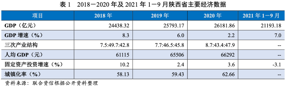 陜西省經(jīng)濟(jì)總量和人均GDP保持全國(guó)中游水平。2020年,受新冠肺炎疫情影響,陜西省經(jīng)濟(jì)增速有所放緩,2021年1-9月呈恢復(fù)性增長(zhǎng),但固定資產(chǎn)投資后勁不足,整體投資呈負(fù)增長(zhǎng)狀態(tài)。陜西省政府債務(wù)余額持續(xù)增長(zhǎng),2020年末排名全國(guó)第17位,政府債務(wù)率與負(fù)債率均處于全國(guó)中游水平,政府債務(wù)風(fēng)險(xiǎn)可控。