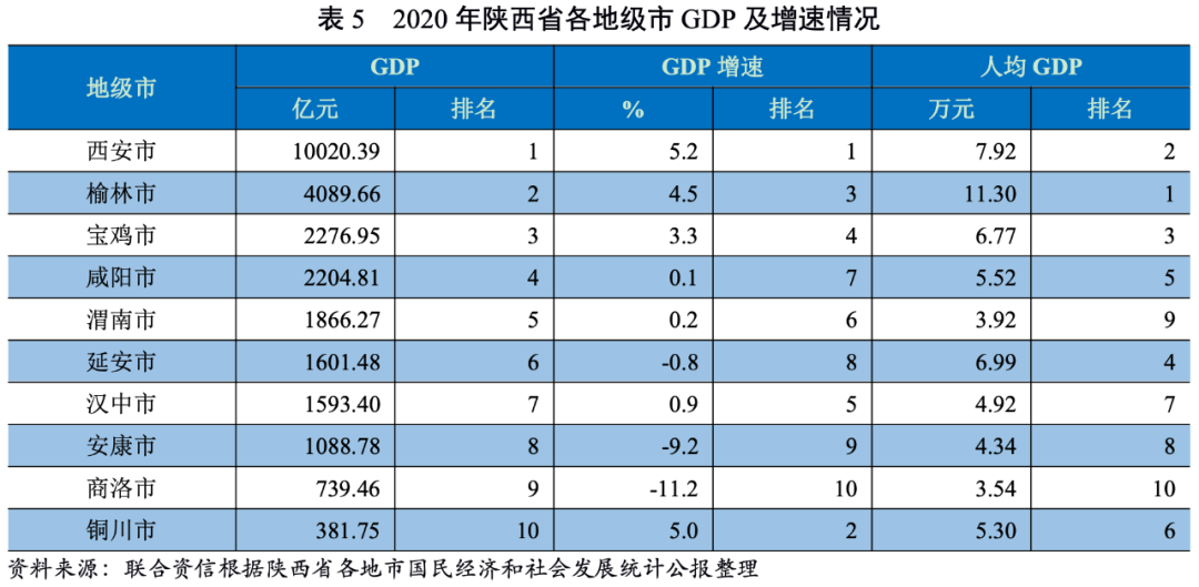 從GDP規(guī)模來(lái)看,2020年,省會(huì)城市西安市以10020.39億元居于榜首,占全省經(jīng)濟(jì)總量的38.27%,榆林市以4089.66億元位居第二,寶雞市和咸陽(yáng)市分別以2276.95億元和2204.81億元位列第三和第四。除以上地級(jí)市外,其他地級(jí)市GDP均未超過(guò)2000億元。銅川市自然資源豐富,以重工業(yè)為主,經(jīng)濟(jì)發(fā)展較為滯后,2020年經(jīng)濟(jì)總量處于陜西省末位。