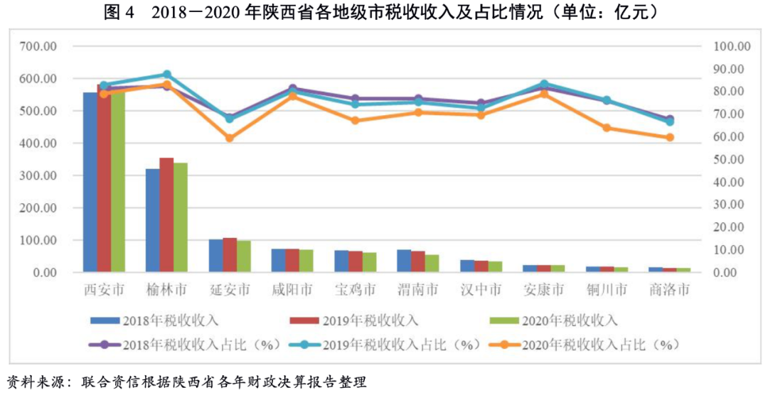 2018-2020年,陜西省大部分地級(jí)市稅收收入占比呈下降趨勢(shì),榆林市稅收收入占比有所提升。2020年,西安市、榆林市、咸陽(yáng)市和安康市稅收收入占比超過(guò)75%,其他地級(jí)市稅收占比均在55%~75%之間,主要系受新冠肺炎疫情、減稅降費(fèi)和經(jīng)濟(jì)下行等因素影響所致。整體上,陜西省各地級(jí)市一般公共預(yù)算收入質(zhì)量較好。