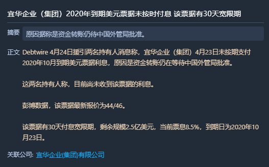 就在此次降級(jí)之前,美元債的付息逾期事件,或許驗(yàn)證了宜華企業(yè)資金緊張的事實(shí)。4月24日,來(lái)自BondInsight的消息顯示4月23日宜華企業(yè)(集團(tuán))未按時(shí)支付2020年10月到期美元票據(jù)利息有關(guān),該票據(jù)有30天付息寬限期。