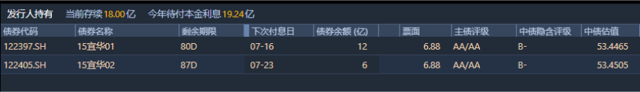 宜華生活當(dāng)前流通中債券存續(xù)余額18億元,今年待付本息高達(dá)19.24億元。