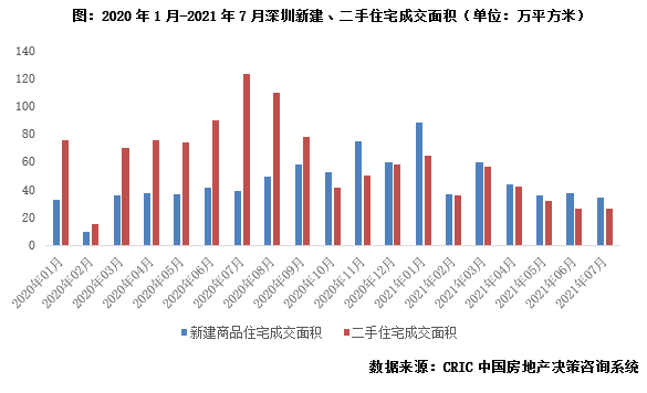 2021年2月,深圳率先落地二手房成交參考價,疊加監(jiān)管部門嚴打經(jīng)營貸,嚴防信貸資金違規(guī)流入房地產(chǎn)市場。受此影響,2021年二季度以來,深圳二手房市場下行壓力加劇,成交逐月走低,6、7兩月二手住宅成交面積低至26萬平方米,再創(chuàng)年內(nèi)新低。