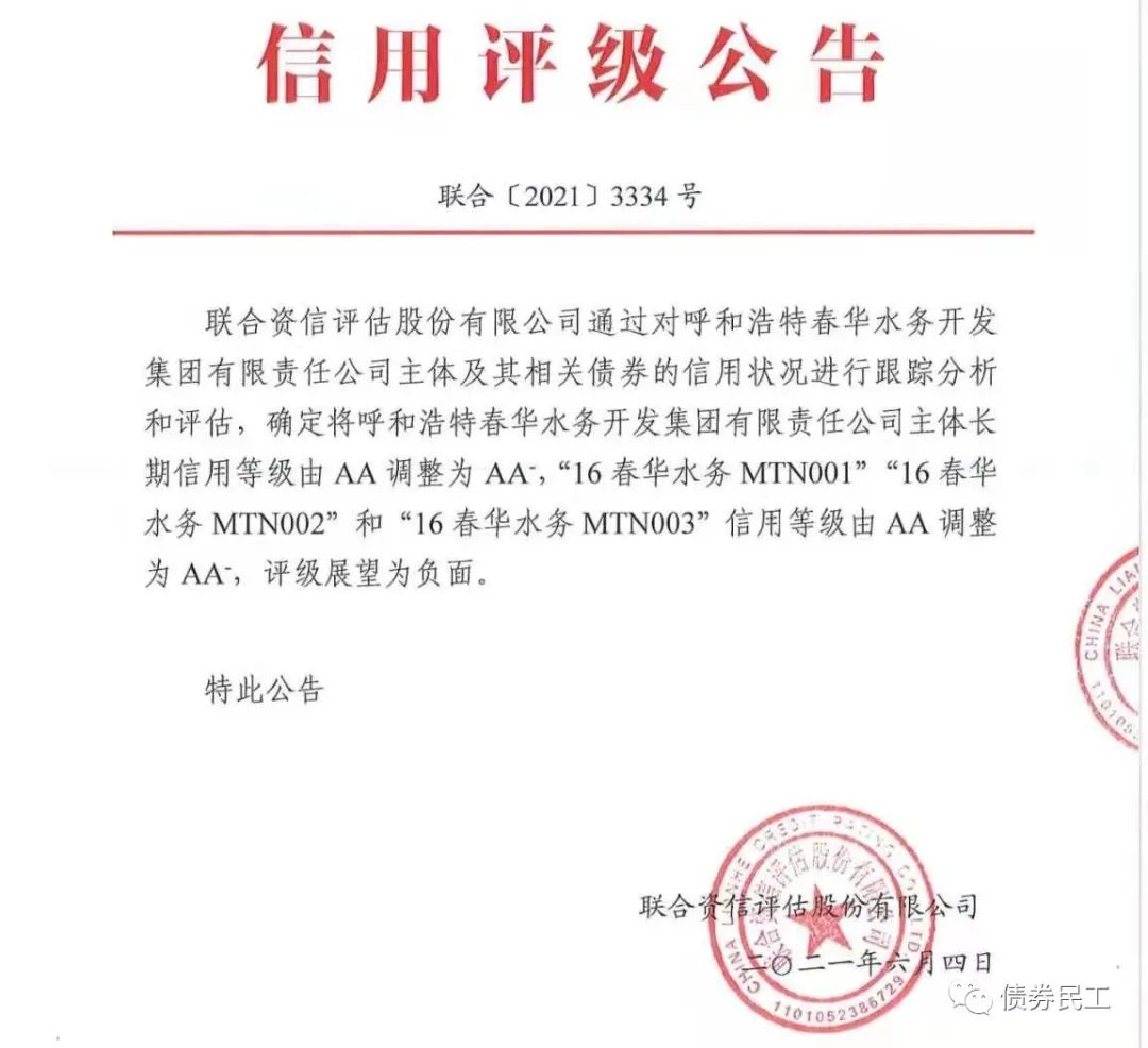 在此之前的2021年5月7日,聯(lián)合資信評估股份有限公司披露了《關(guān)于呼和浩特春華水務(wù)開發(fā)集團(tuán)有限責(zé)任公司部分債務(wù)逾期的關(guān)注公告》,將會(huì)持續(xù)跟蹤債務(wù)逾期事項(xiàng)對公司帶來的影響,但并未下調(diào)春華水務(wù)的主體信用評級。