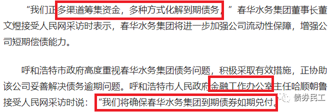 春華水務(wù)此次引起信用債券市場較大的關(guān)注始于2021年4月30日通過公告披露自身債務(wù)逾期事件。大家關(guān)注的焦點(diǎn)在于春華水務(wù)是否屬于城投公司以及后續(xù)是否會(huì)引發(fā)存續(xù)債券的違約。在春華水務(wù)債務(wù)逾期事件的發(fā)酵過程中,5月7日晚人民網(wǎng)刊登了《春華水務(wù)集團(tuán)債務(wù)逾期總體可控 政府多措并舉緩解流動(dòng)性》文章,春華水務(wù)董事長表示將“多種方式化解到期債務(wù)”,呼和浩特市金融工作辦公室主任表示“將確保春華水務(wù)到期債券如期兌付”。這是春華水務(wù)債務(wù)逾期之后,官方對于債務(wù)問題解決最直接的表態(tài),表達(dá)了解決春華水務(wù)債務(wù)問題的信心。
