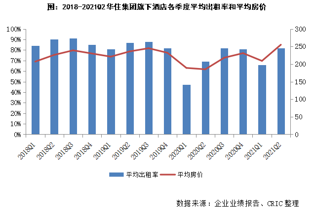 雖然我國酒店業整體的恢復相對較慢,但是作為龍頭企業的華住集團的恢復情況卻相對較好。從企業的業績報告數據來看,華住從2020年三季度開始其旗下酒店單季度的平均出租率就基本恢復到了疫情前的水平,平均房價也逐漸提升,2021年二季度還達到了近年來最高的255元/天。
