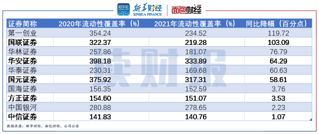 圖8:2021年流動性覆蓋率同比降幅較大的前十家上市券商