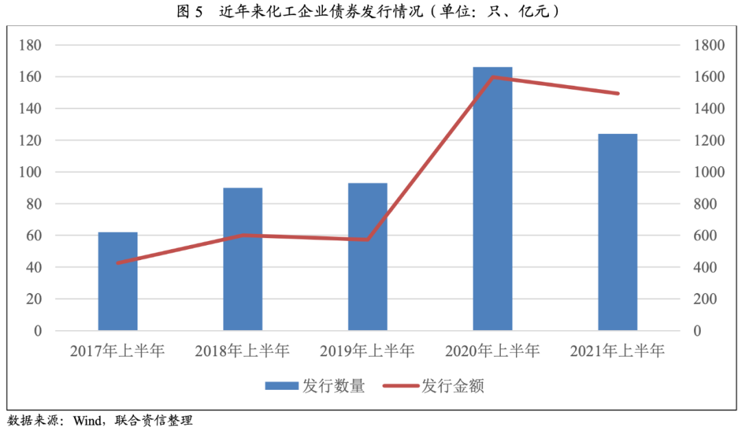 2021年上半年,疫情對中國經濟的影響逐漸消退,中國穩健的貨幣政策在保持流動性合理充裕的同時,強化了對實體經濟、重點領域以及薄弱環節的支持。具體到信用債方面,2021年上半年,化工企業信用債的發行規模同比有所下降,但仍處于近五年相對高位。通過對申萬化工分類數據整理,截至2021年6月底,化工企業發行各類信用債券(全部市場,含可轉債和私募債,下同)124只,同比減少42只;發行規模1494.40億元,較上年同期下降6.46%,從發行量到發行規模同比均有所下降,但均已超過新冠肺炎疫情爆發前水平。其中,發行量較2017年同期增加62只,發行金額較2017年同期大幅增長251.46%,化工行業信用債融資熱情較高。