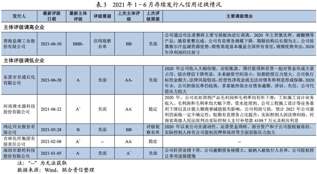 2021年1-6月,化工企業信用遷徙情況如下表所示,其中,評級上調的僅有青海鹽湖工業股份有限公司,主體評級由BB上調為BBB,評級上調主要基于其司法重整將主要虧損板塊剝離,財務狀況改善。評級下調的涉及5家,4家下調一個子級,1家下調兩個子級(深圳市新綸科技股份有限公司由A+下調為A-),評級下調因素主要涉及經營業績下滑、流動性緊張、訴訟等因素。
