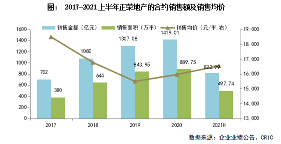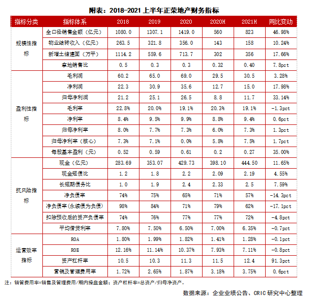 2021上半年,正榮實現全口徑銷售金額822.99億元,同比增長46.98%,超出TOP30同期的銷售額增速32.59%,全年目標完成率54.05%,銷售面積同比增長36.19%至497.74萬平。根據披露的權益拿地銷售比,可計算出正榮期內權益銷售444.85億元,銷售權益比54.05%,未來權益比應控制在適當范圍內以保障后續母公司結轉的盈利空間。