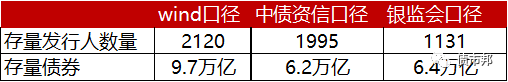以2019年6月底的城投債存量金額為例,三個(gè)口徑的關(guān)系是wind口徑(9.7萬(wàn)億)>銀保監(jiān)會(huì)口徑(6.4萬(wàn)億)>中債資信口徑(6.2萬(wàn)億)。wind口徑和中債口徑的差異除了納入城投名單的發(fā)行人不同外,兩者還對(duì)同一發(fā)行人的不同債項(xiàng)認(rèn)定方面有差異(其實(shí)不太理解對(duì)于同一發(fā)行人,為什么中債資信會(huì)把部分債項(xiàng)認(rèn)定為是城投債,而對(duì)其他債項(xiàng)又認(rèn)為是非城投債)。