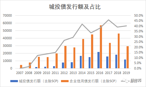 從發(fā)行情況上來(lái)看,城投的存在感也是在不斷增強(qiáng)的,占所有企業(yè)類(lèi)信用債的發(fā)行額的比重逐年上升。在去除超短期融資券SCP發(fā)行量之后,可以看到城投債占企業(yè)類(lèi)信用債的發(fā)行占比已經(jīng)達(dá)到了40%的比重了。