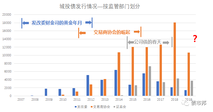 2012年以前城投債是發(fā)改委主管的企業(yè)債獨(dú)領(lǐng)風(fēng)騷,2012至2014年是NAFMII主管的債務(wù)融資工具異軍突起,2015年則是證監(jiān)會(huì)主管的公司債接過(guò)了城投債增量的大旗。