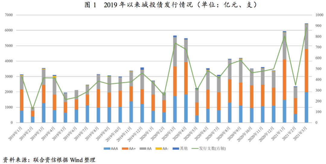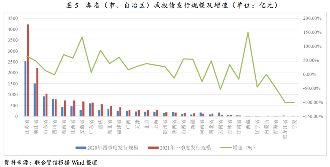 受2021年再融資需求擴(kuò)大及市場(chǎng)情緒修復(fù)的影響,一季度城投債發(fā)行數(shù)量及規(guī)模大幅增長。