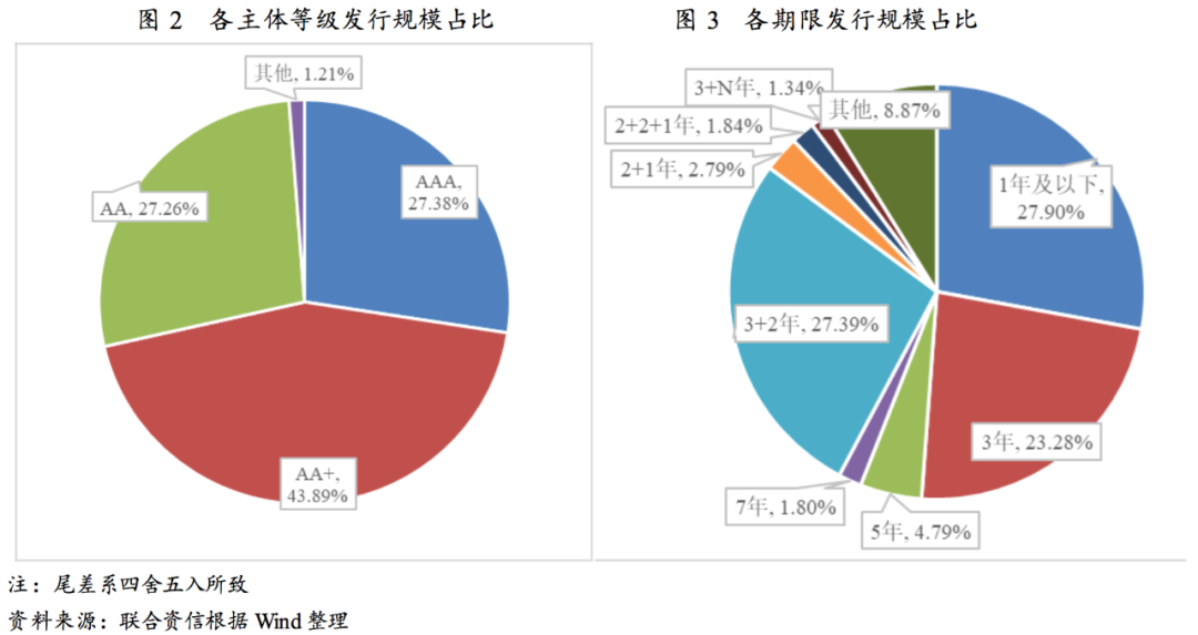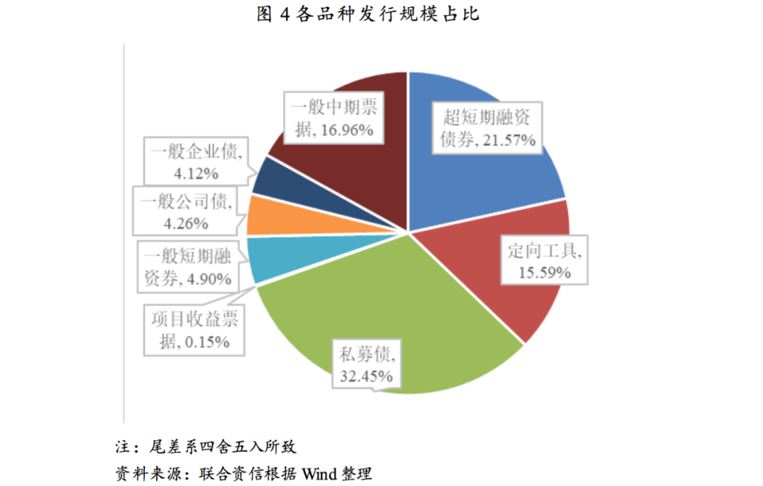 公、私募發(fā)行規(guī)模占比保持均衡態(tài)勢(shì),公募占比略有上升;發(fā)行期限仍以中短期為主,3年期發(fā)行規(guī)模占比進(jìn)一步上升;發(fā)行品種以私募公司債和超短期融資券為主,一般中期票據(jù)和定向工具發(fā)行規(guī)模快速增長。