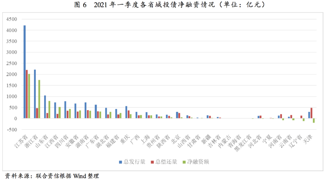 一季度城投債凈融資規(guī)模達(dá)7408.87億元,環(huán)比大幅增長57.67%。其中,江蘇省和浙江省凈融資規(guī)模分別為2016.93億元和1742.43億元,環(huán)比分別增長90.25%和60.81%,凈融資規(guī)模明顯領(lǐng)先于其他各省;山東省凈融資規(guī)模794.33億元,環(huán)比增長32.89%。城投債凈融資為負(fù)的省份包括天津、遼寧省、云南省、河南省、河北省、黑龍江省及寧夏回族自治區(qū),其中遼寧省和黑龍江省連續(xù)多個(gè)季度凈融資為負(fù),河南省受永煤事件影響城投債凈融資持續(xù)為負(fù)。東北及西部經(jīng)濟(jì)欠發(fā)達(dá)或區(qū)域債務(wù)壓力較大地區(qū)融資環(huán)境無明顯改善。