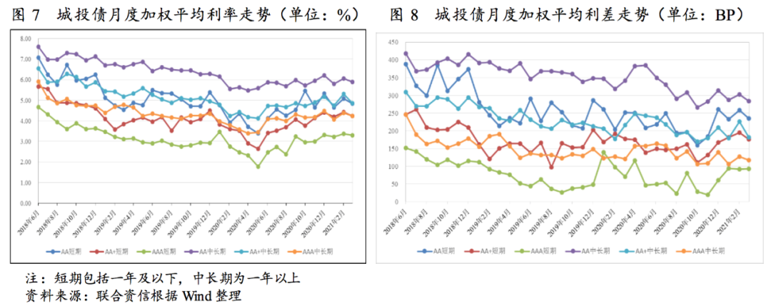 2020年下半年以來,隨著新冠肺炎疫情形勢(shì)趨穩(wěn),宏觀經(jīng)濟(jì)穩(wěn)步回升,貨幣政策逐步回歸常態(tài)化,資金面整體有所趨緊。2021年一季度,各級(jí)別、期限城投債的發(fā)行利率同比均有所上升。環(huán)比來看,各級(jí)別短期城投債的發(fā)行利率環(huán)比均小幅上升,各級(jí)別中長期城投債的發(fā)行利率均略有下降,主要是在春節(jié)前后時(shí)點(diǎn)因素以及央行公開市場(chǎng)大規(guī)模凈回籠影響下,2021年初市場(chǎng)流動(dòng)性短暫趨緊、投資者期限偏好呈現(xiàn)分化所致。分月來看,1月,各級(jí)別、各期限城投債的發(fā)行利率相對(duì)較低,且環(huán)比均有所下降,其中AA級(jí)中長期、AA+級(jí)中長期和AAA級(jí)中長期分別環(huán)比下降0.41個(gè)、0.44個(gè)和0.41個(gè)百分點(diǎn),整體拉低了一季度各級(jí)別中長期城投債發(fā)行利率的平均水平;2月,各級(jí)別、各期限城投債的發(fā)行利率均明顯上升;3月,各級(jí)別、期限城投債的平均發(fā)行利率環(huán)比均有所下降,但整體小幅高于1月的平均水平。一季度,各級(jí)別、期限城投債發(fā)行利率呈現(xiàn)先上升后下降的“倒V”形態(tài)。