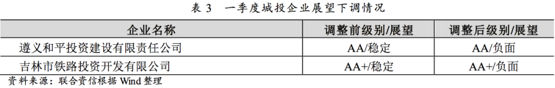 一季度,城投企業(yè)主體級(jí)別無調(diào)降的情況。評(píng)級(jí)展望由穩(wěn)定調(diào)整為負(fù)面的城投企業(yè)2家,貴州省和吉林省各1家,展望下調(diào)原因主要包括區(qū)域融資環(huán)境較差、企業(yè)自身流動(dòng)性壓力較大、新增不良信貸記錄等。