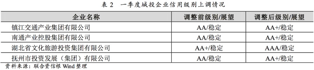 一季度,主體級(jí)別調(diào)升的城投企業(yè)共4家,其中,主體級(jí)別自AA上調(diào)至AA+的城投企業(yè)3家,AA+上調(diào)至AAA的城投企業(yè)1家;主體信用級(jí)別調(diào)升的城投企業(yè)位于江蘇省、湖北省和江西省。