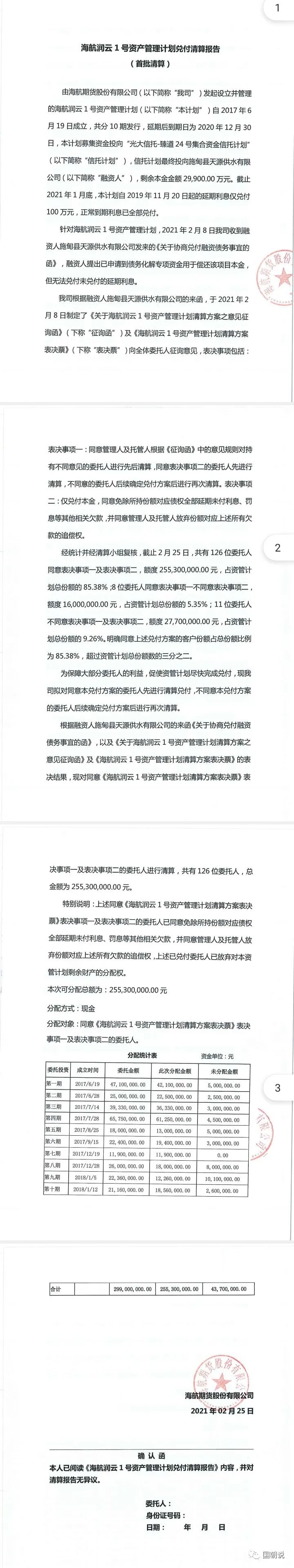2021年2月25日,海航期貨發布了《海航潤云1號資產管理計劃兌付清算報告(首次清算)》。
