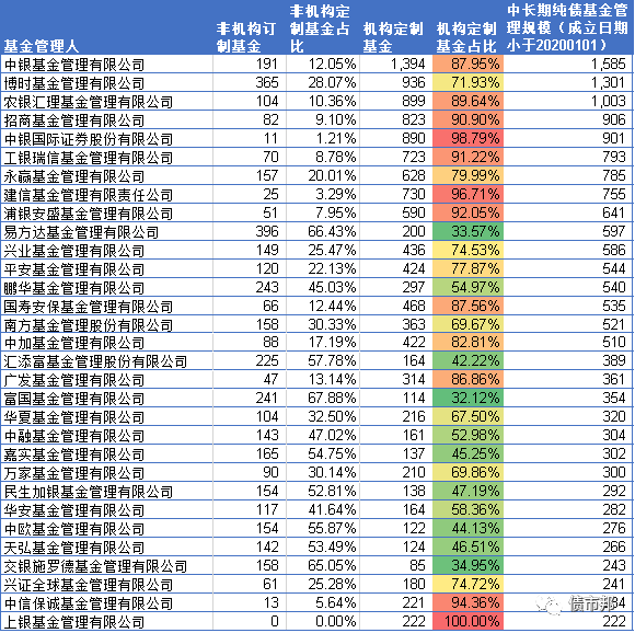 計算了下目前中長期純債基金管理規(guī)模在200億元以上的機構,非常可悲地看到,機構定制基金占比低于40%的,只有易方達、富國、交銀施羅德3家機構,中銀國際證券、工銀瑞信基金、建信基金、浦銀安盛等,產品完全淪為銀行的通道,機構定制基金的規(guī)模占比超過了90%。