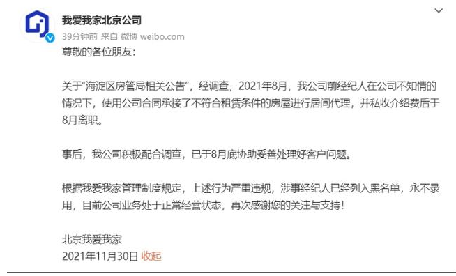 11月30日,我愛我家北京公司對上述消息回應稱,關于“海淀區房管局相關公告”,經調查:
