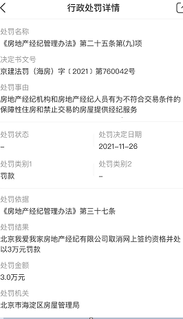 11月26日,北京我愛我家房地產經紀有限公司新增行政處罰,違法事實為,房地產經紀機構和房地產經紀人員,有為不符合交易條件的保障性住房和禁止交易的房屋提供經紀服務。