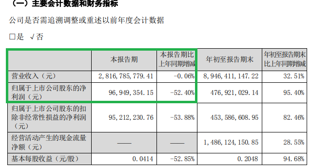 我們接著看會發現,更嚴重的歸母凈利潤只有9000多萬元,同比下滑52.4%。而前2個季度,動輒1、2億元的凈利潤。