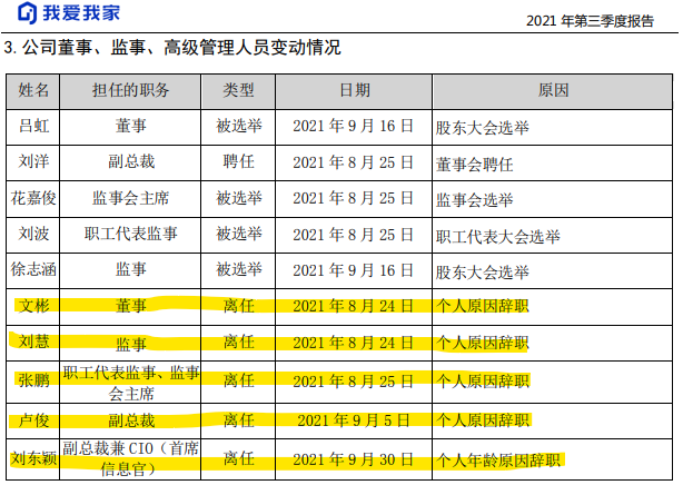 另外杠桿地產從三季報中注意到,三季度我愛我家高達5位董監高離任。