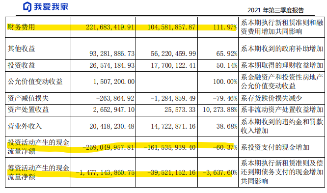 前三季度,我愛我家投資活動產生的現金流量凈額-2.59億元,2020年同期為-1.62億元。原因是投資支付的現金增加。