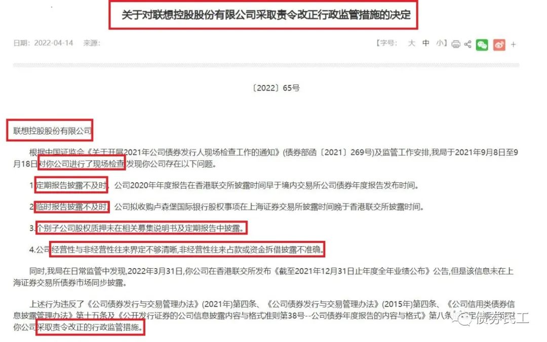 從北京證監局官網披露的內容來看,聯想控股存在的問題主要是集中在信息披露的問題。關于信息披露問題,上海證券交易所于2021年4月29日發布了《公司債券自律監管規則適用指引第1號——公司債券持續信息披露》,明確了公司債券存續期信息披露的具體要求,包括對定期報告和臨時報告的要求。
