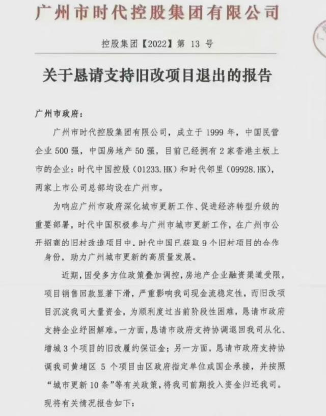 4月初,一份時代中國《關于懇請支持舊改項目退出的報告》流出。因懇請政府協調退還舊改項目投入的20.1億元資金而備受關注。