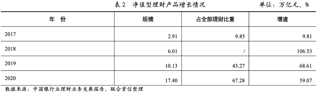 理財產(chǎn)品向凈值化轉型成為重要發(fā)展方向。銀行傳統(tǒng)保本理財產(chǎn)品的風險由銀行而并非投資者承擔,理財產(chǎn)品規(guī)模的不斷增長使得潛在的剛性兌付壓力日漸增加,并成為制約銀行理財業(yè)務發(fā)展的主要因素,但資管新規(guī)的發(fā)布使得理財產(chǎn)品凈值化轉型成為必然趨勢,“剛性兌付”將逐漸被打破。近年來,銀行凈值化理財產(chǎn)品規(guī)模快速上升,占全部理財產(chǎn)品的比重增長較為明顯(見表2),理財產(chǎn)品凈值化進程不斷推進。