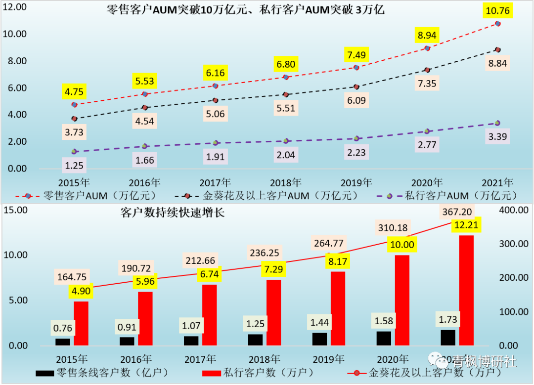 綜上,招行零售客戶、金葵花及以上客戶、私行客戶AUM的2021年全年增量分別相當(dāng)于3家中小銀行、2家中小銀行以及1家中小銀行的總資產(chǎn)規(guī)模。