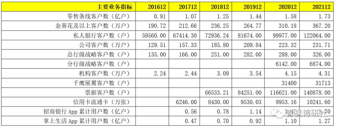 1、對于客戶數(shù),招商銀行有非常詳細(xì)的分類,如在財報中基本會披露零售客戶數(shù)、APP活躍戶、借記卡和信用卡流通量、財富管理(含金葵花及以上和私行)客戶數(shù)、企業(yè)客戶數(shù)、機(jī)構(gòu)合作客戶數(shù)、票據(jù)客戶數(shù)、兩大App累計用戶數(shù)等信息,并由此衍生出對應(yīng)的AUM、MAU理財銷售額等指標(biāo)。