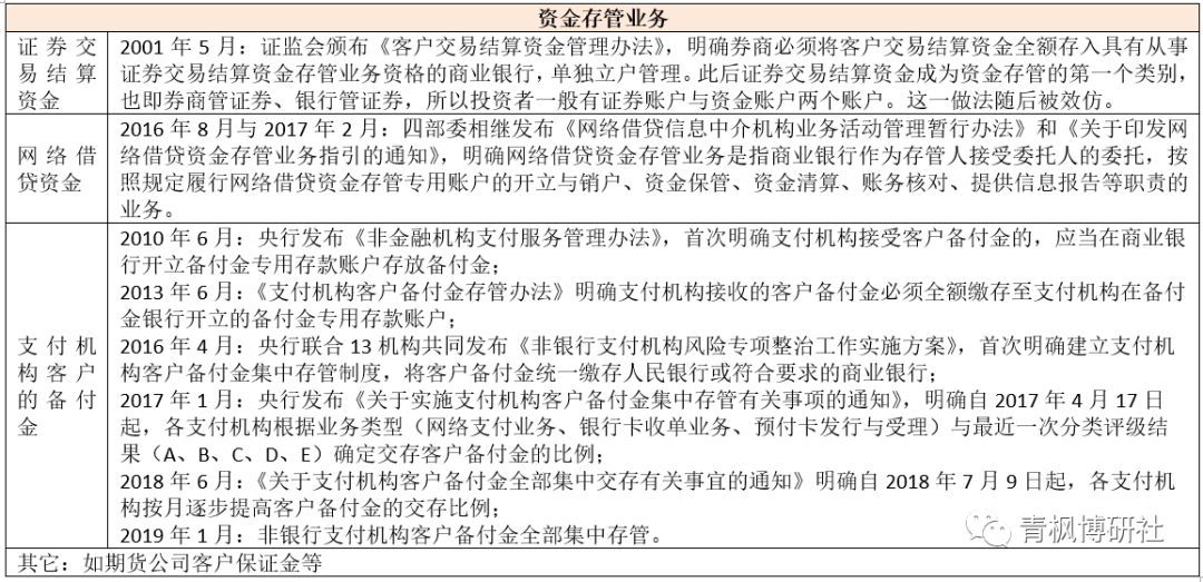 (1)資金存管不對交易的實質進行審核,且針對性往往較強,其目的是為了防止客戶資金被挪用,主要包括證券客戶的交易結算資金、網絡借貸資金、支付機構客戶的備付金以及風險保障基金等等。