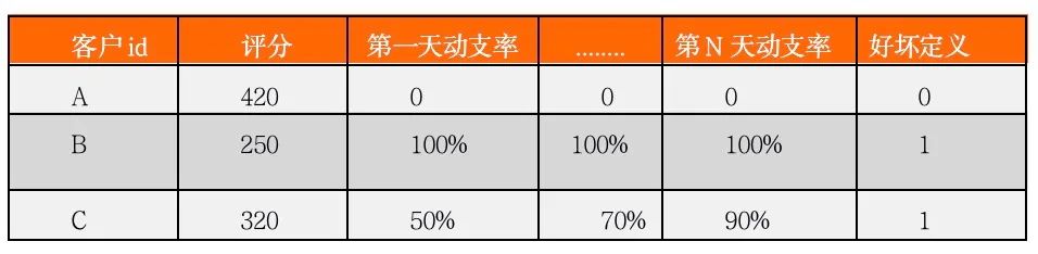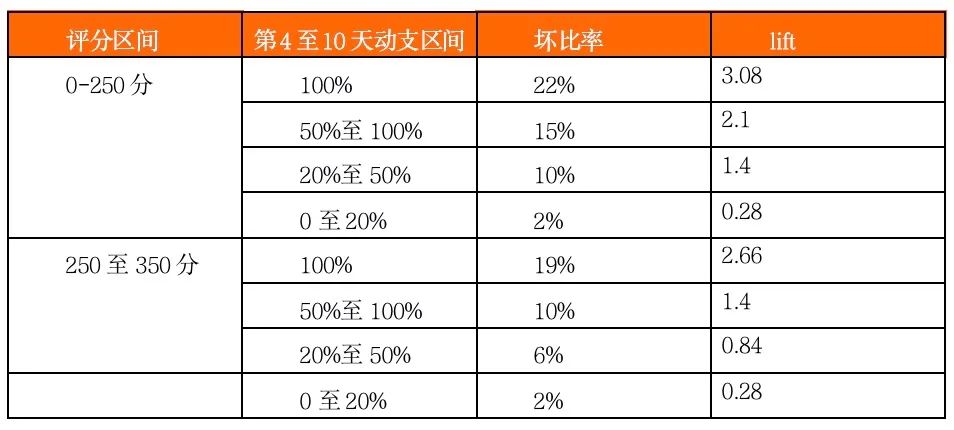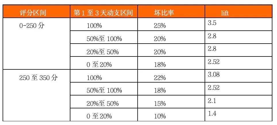 我們把未動支、未逾期客戶定義為好客戶,去除有逾期記錄灰客戶,通過轉(zhuǎn)移矩陣(滾動率)定義逾期N天以上為壞客戶。建立評分卡模型后,驗證好灰壞的排序性,同時針對建模和驗證客戶我們做動支分析。我們做貸中動支策略,首先是對動支評分、動支率、動支天數(shù)的觀察定策略。舉例: