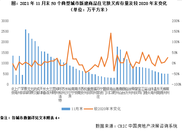 三四線城市狹義庫存較2020年末漲多跌少,不同城市間分化持續(xù)加劇:欽州、臨沂、衡陽、岳陽等城市主要源于歷史遺留問題,庫存基數(shù)較大,疊加成交轉(zhuǎn)淡,使得狹義庫存漲幅均在3成以上;而中山、惠州、東莞、汕頭等東南沿海城市則主要受到政策“調(diào)控”影響,成交被抑制,數(shù)據(jù)實(shí)難反映真實(shí)的市場需求。此外,少部分城市諸如三亞、漳州、晉江、德清等11月庫存較2020年末跌幅均在30%以上,庫存風(fēng)險(xiǎn)相對較小。
