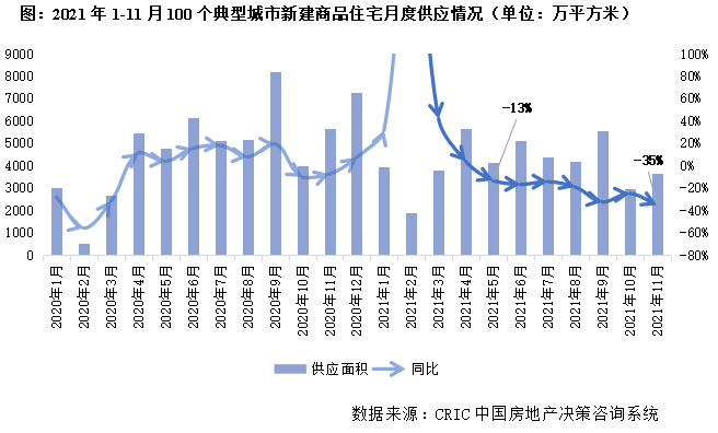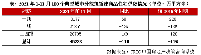 據(jù)CRIC統(tǒng)計(jì),2021年前11月全國100個(gè)重點(diǎn)城市商品住宅新增供應(yīng)面積45233萬平方米,相較2020年和2019年均同比下降11%。受新開工萎靡影響全年新房供應(yīng)規(guī)模縮減至近三年低點(diǎn)。
