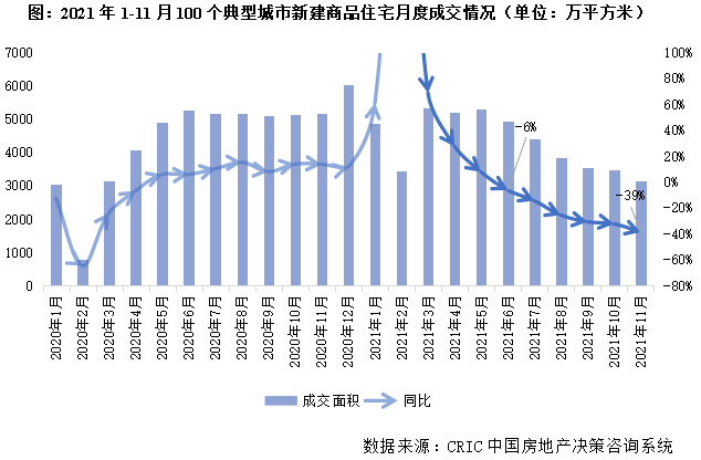 CRIC數(shù)據(jù)統(tǒng)計(jì)顯示,全國100個(gè)典型城市2021年前11月商品住宅成交面積合計(jì)47529萬平方米,同比增1%。