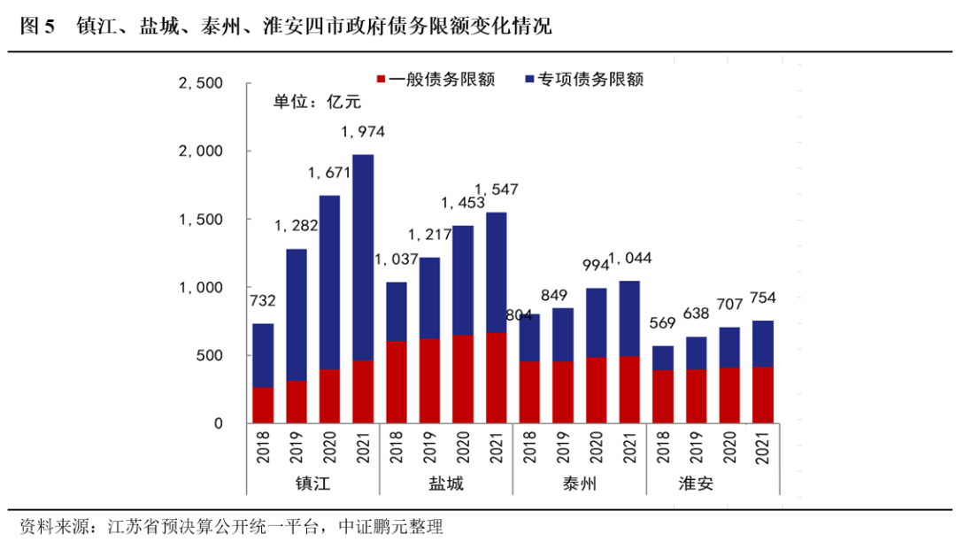 鎮(zhèn)江市政府債務(wù)限額及再融資債券增長規(guī)模均優(yōu)于省內(nèi)其他弱區(qū)域,佐證了省級(jí)層面化債支持。從政府債務(wù)限額角度來看,2018年-2021年,鎮(zhèn)江市政府債務(wù)限額從732億元大幅提升至1,974億元,增幅遠(yuǎn)超其他蘇北地區(qū)債務(wù)較重區(qū)域(鹽城、泰州、淮安)。期間,2019年及2020年,鎮(zhèn)江市本級(jí)發(fā)行再融資債券15.70億元和85.49億元用于置換存量債務(wù)。政府債務(wù)限額的提升及再融資債券發(fā)行規(guī)模的增長,佐證了政府化債舉措,亦反映了省政府對(duì)鎮(zhèn)江市化債的支持。