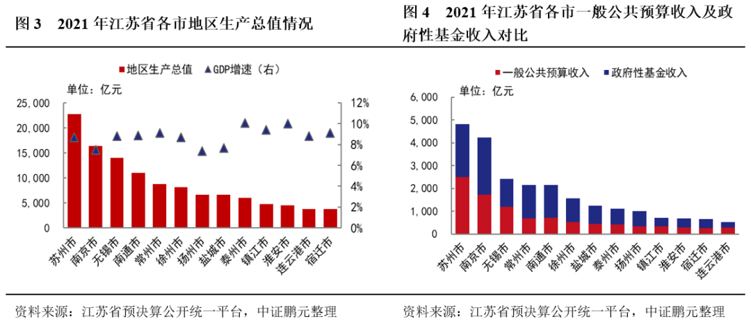 從全省情況來看,江蘇省經(jīng)濟(jì)財(cái)政實(shí)力依然位居全國前列。2021年,江蘇省實(shí)現(xiàn)GDP總量11.64萬億元,人均GDP13.70萬元,是全國人均GDP的169.23%;且近年產(chǎn)業(yè)結(jié)構(gòu)持續(xù)轉(zhuǎn)型升級(jí),工業(yè)實(shí)力雄厚,上市公司數(shù)量居全國第三,經(jīng)濟(jì)發(fā)展活力較強(qiáng)。財(cái)政方面,2021年全省實(shí)現(xiàn)一般公共預(yù)算收入10,015.2億元,政府性基金收入13,632.95億元,分列全國第2和第1。雖然江蘇省廣義債務(wù)率處于全國較高水平,但其經(jīng)濟(jì)財(cái)政實(shí)力雄厚,且產(chǎn)業(yè)結(jié)構(gòu)合理,短期內(nèi)可對(duì)債務(wù)償還形成有力支撐。