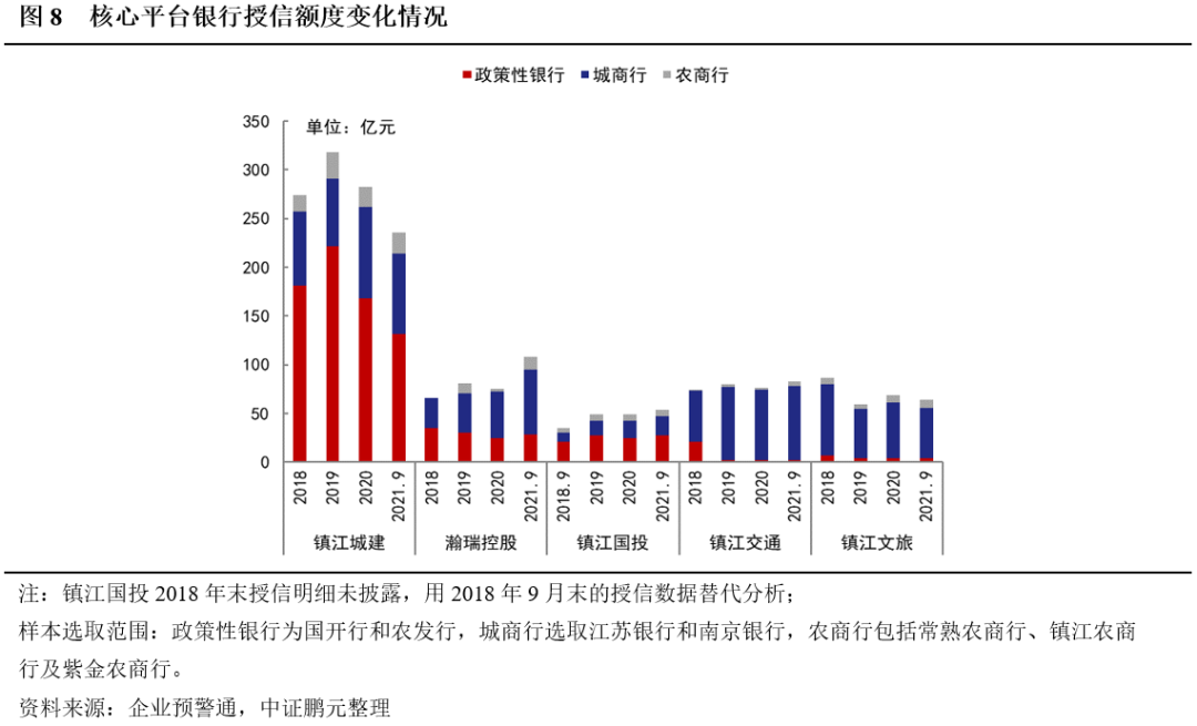 省內(nèi)城農(nóng)商行對(duì)五大核心平臺(tái)融資支持力度較大,授信規(guī)模增加明顯。由于鎮(zhèn)江尋求國開行進(jìn)行隱性債務(wù)置換的方案未最終落地,政策性銀行對(duì)鎮(zhèn)江城投平臺(tái)的融資支持力度較弱且缺乏普遍性。2018年到2019年期間,僅鎮(zhèn)江城建一家平臺(tái)獲國開行大幅提額,且2020年起五大平臺(tái)在政策性銀行的授信額度遭遇整體壓降。而城農(nóng)商行貸款主要集中于江蘇省內(nèi),與地方政府關(guān)系密切,在化解隱債的過程中更有可能成為政府協(xié)調(diào)金融資源的主要渠道。江蘇省內(nèi)共有4家城商行和56家農(nóng)商行,截至2020年末,總資產(chǎn)規(guī)模合計(jì)72,465.30億元,其中江蘇銀行及南京銀行總資產(chǎn)規(guī)模均超萬億元,可協(xié)調(diào)的金融資源較為豐富。2018年-2021年9月期間,省內(nèi)城農(nóng)商行對(duì)五大平臺(tái)的授信額度整體增加了79.54億元,融資支持力度更大且更具有普遍性和持續(xù)性。
